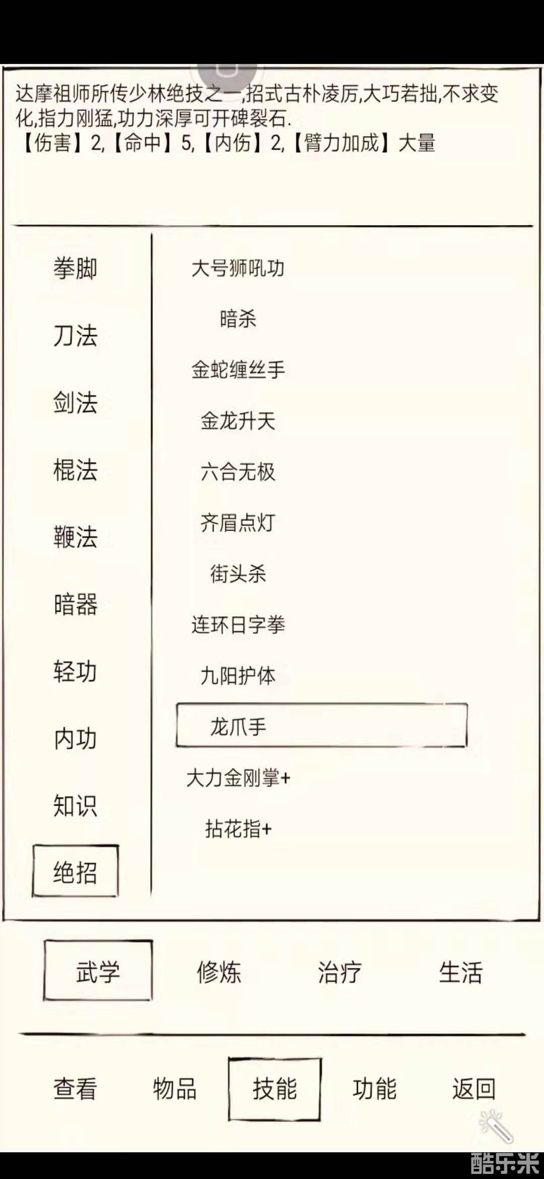 龙爪手,面板无奇的技能(特效很无耻且猥琐),但是强在使用后有两个debuff,分别为:破甲:减少敌方25防御三回合,重创:减少对方身法臂力20%三回合,附加当前攻击力*1伤害的流血效果三回合(会被猫叫走)。