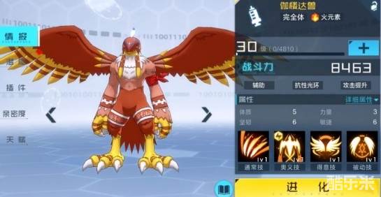 3、其中迦楼达兽是这个队伍的核心,奥义技能可以提升我方的攻击最高的火数码兽40%的伤害,可以在前几回合打出高额伤害;