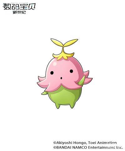4、莲花兽:妖精型数码宝贝,奥义技是右手所持的彩虹色花杖散发出的七色灵气“七重幻想曲”将对方引诱到幸福的幻想世界,使其丧失斗志。