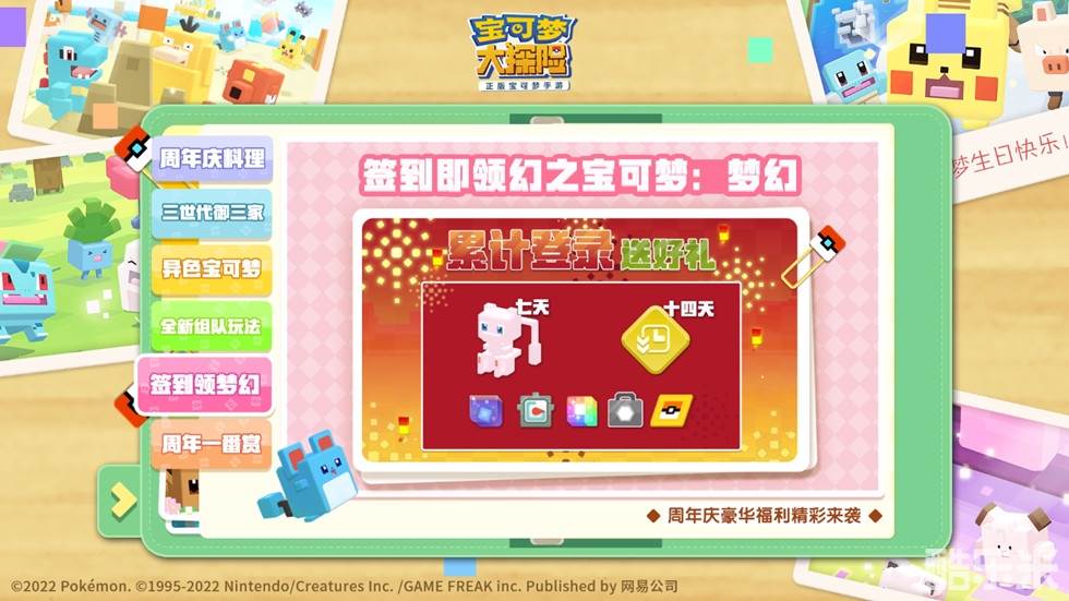 inc.携手开发的《宝可梦大探险》周年庆典第二弹来袭,与万代一番赏合作为各位探险家带来的周年特别一番赏闪亮登场!更有网易520发布会惊喜预告,今日登录即领520福利雨豪华奖励,还有签到领幻之宝可梦:梦幻!超多惊喜等你解锁~
