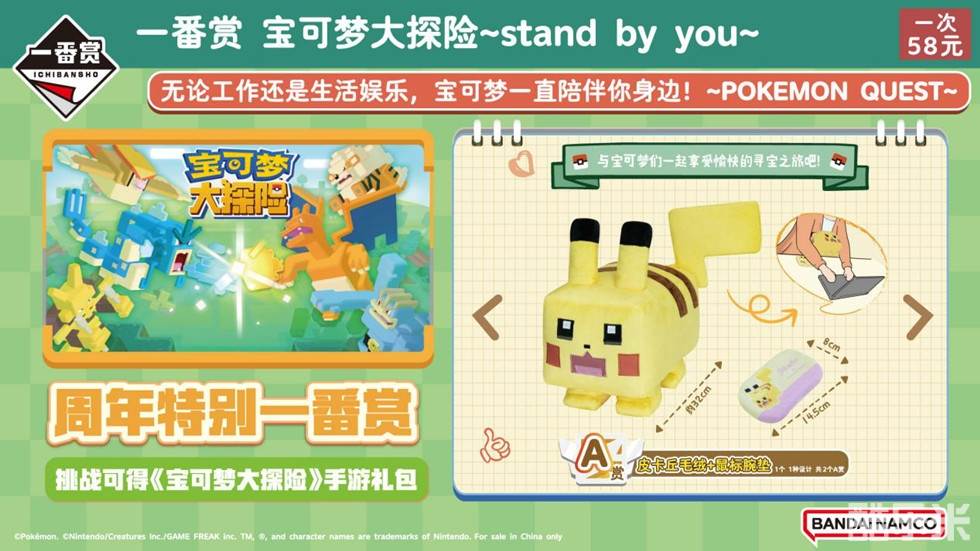 在万代一番赏周年庆特别联动中,《宝可梦大探险》推出了多个赏品,以后的日子里,探险家们和宝可梦一起享受愉快的寻宝之旅吧~