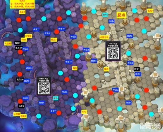 1、在起点位置,走向永恒之书,触发剧情,随后进入传送1对面区域,清除小怪(3个小能量),然后前往传送3清除小怪(2个小能量),找到机关1触发剧情