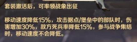 套装激活后,可率领战象出征。移动速度降低15%,攻击据点/堡垒中的部队时,伤害增加30%,敌方死兵率降低15%,参与战争集结时,移动速度不会降低。