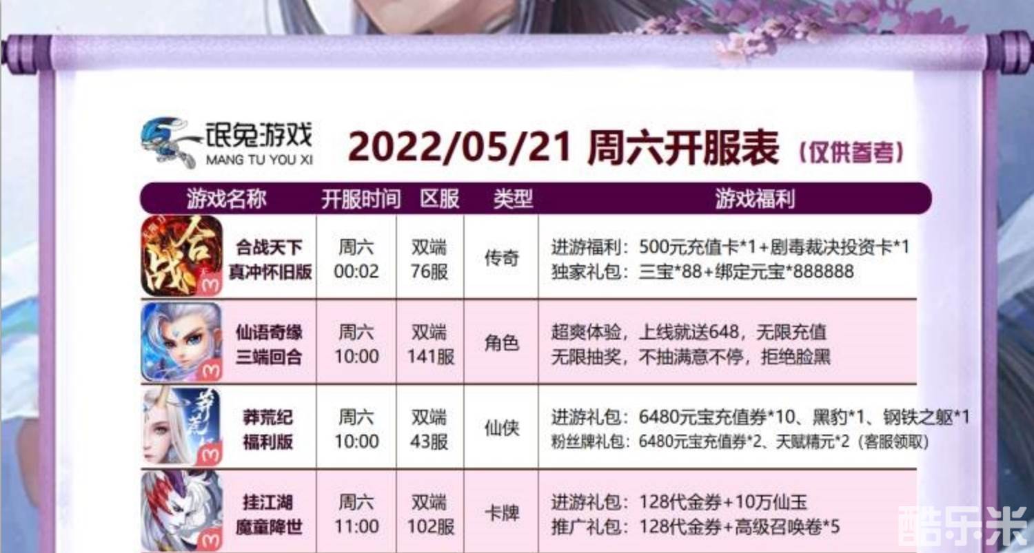 | 莽荒纪-福利版 | 莽荒43区( 苹果- 安卓) | 2022-05-21 10:00:00 |