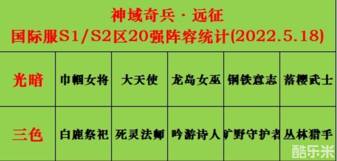 我统计了2022.5.18的国际服S1/S2推图进度各前10大佬的竞技场阵容。如下:(国际服和国服的英雄的技能是一致的,所以人家带什么英雄就说明什么英雄强,不要怀疑氪金玩家用钱包投票出来的英雄的强度)