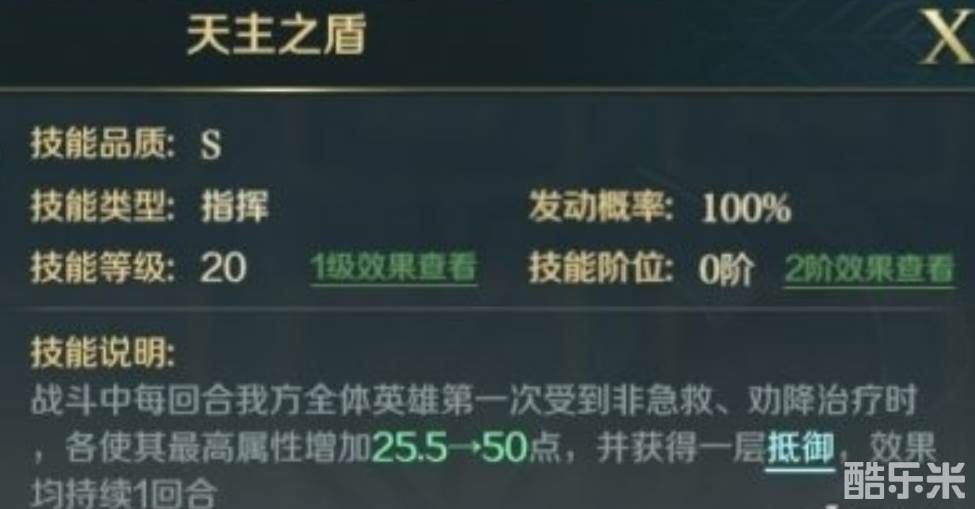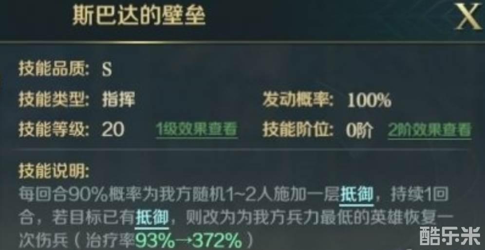 抵御系最佳搭档:斯巴达的壁垒90%概率施加1-2人抵御,配合【天主之盾】等其他附带抵御效果技能,减少我方伤亡的同时,能够大幅度定向为最低兵力英雄恢复伤兵,提升整体队伍坦度。