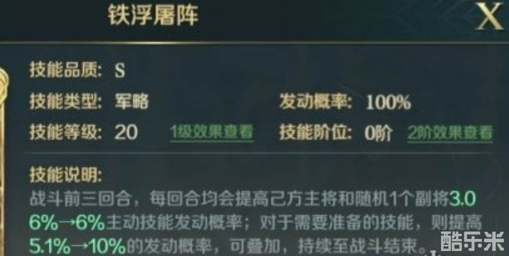 主动队提升技能释放率神技:铁浮屠阵提高主将和随机副将两人技能释放概率的效果,是【战争之王】和织田信长的好搭档,为织田信长的铺火和输出提供了进一步保障。