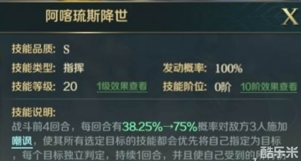 较为稳定的群嘲技能:阿喀琉斯降世前4回合最高75%可以对敌方群体3人施加较为稳定的嘲讽,同时,还为自身附带一定减伤效果。