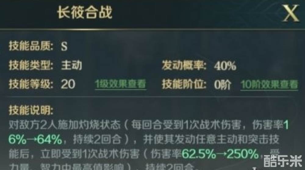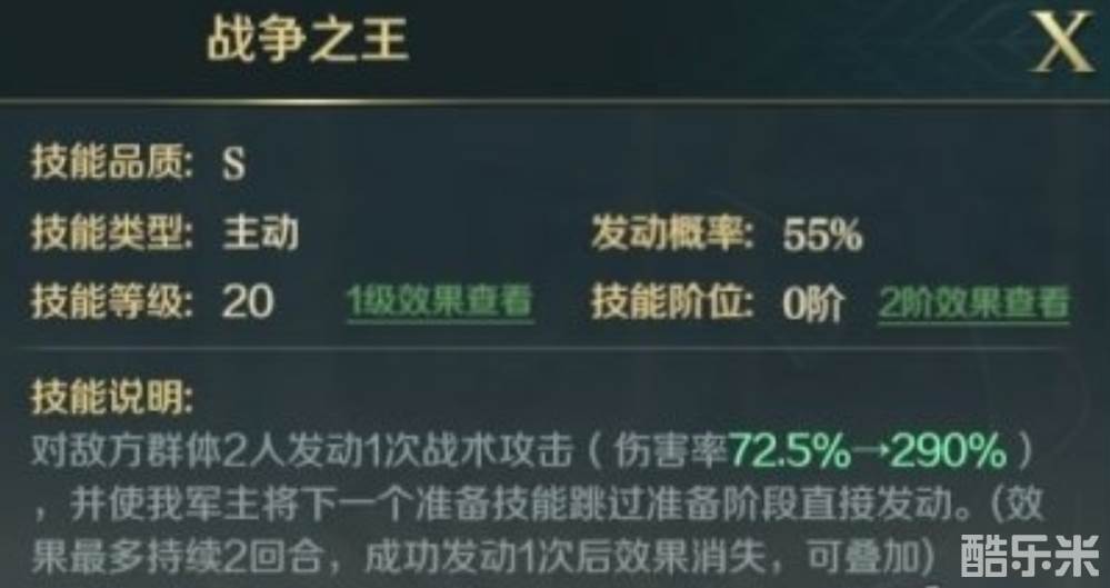核心技能:战争之王55%的发动率注定了它与织田信长有着天然的“默契”配合,让下一个准备技能跳过准备阶段,可以与【尼卡暴动】形成联动,大幅度提升输出能力。