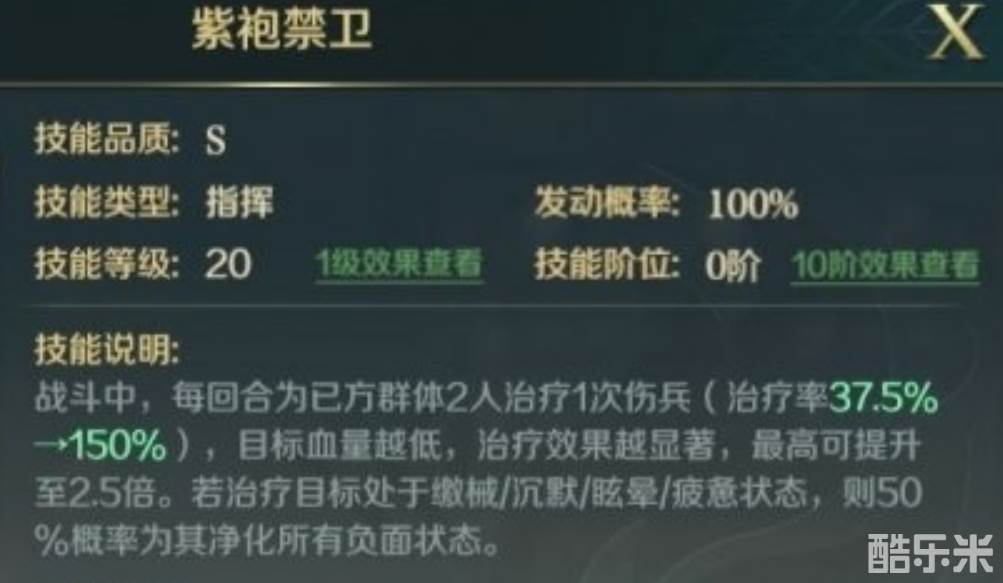 每回合群体2人治疗,且目标血量越低,治疗效果越显著。经过调整之后,还有50%概率净化所有负面状态,这使得凯撒成为当之无愧奶辅第一人选!(PS:疲惫也能净化,这使得肉突队的搭配更趋向于合理,减弱了朦胧对突击队的限制。)
