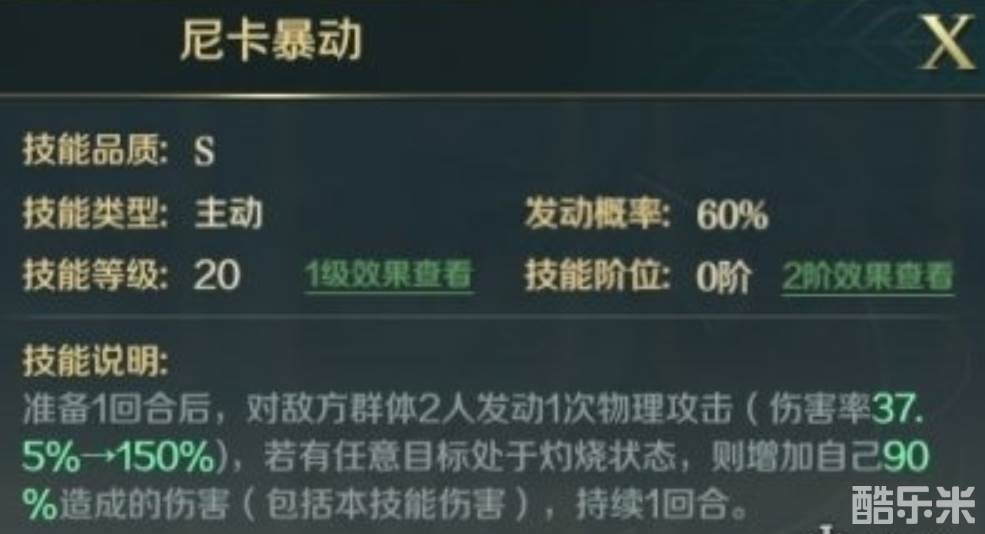 输出强力buff技能:尼卡暴动60%高概率准备群伤技能,在【战争之王】的加持下可以在瞬间为自身提供输出buff——让自己造成的伤害增加90%。