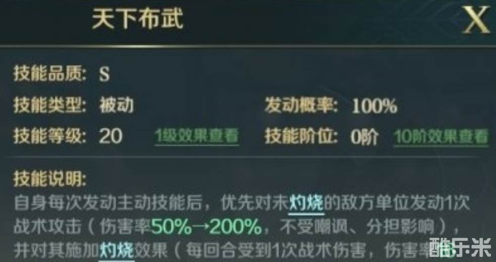 被动技能优先选择未灼烧目标,可以扩大提升铺火覆盖率,为自身输出提供更大的空间,“自身每次发动主动技能后”的要求,表明织田信长需要带高发动率的主动技能,才能充分提升他铺火能力和输出效果。