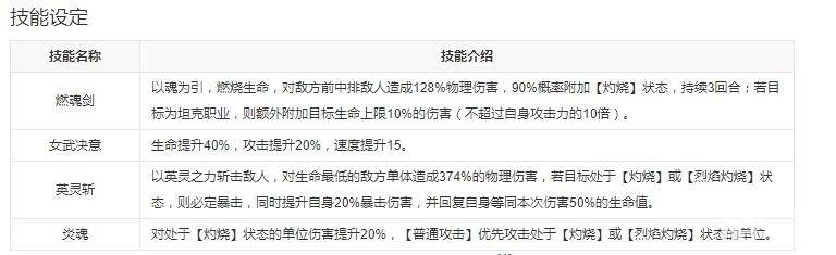 技能解析:一技能对生命最低的3个单位回血,并提升攻击力,火系英雄额外加暴击伤害,并对其中一个单位附加防御、抗爆提升效果;三技能概率附加【灼烧】和【伤害加深】效果。