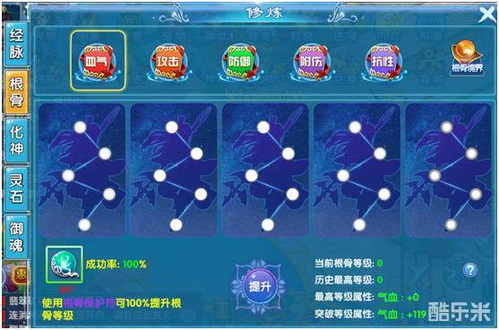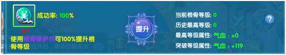 点开根骨,上面出现血气,攻击,防御,附伤,抗性的根骨丹,点击根骨丹后有个黄色边框,下面会显示对应根骨丹的属性以及提升根骨的消耗和成功率