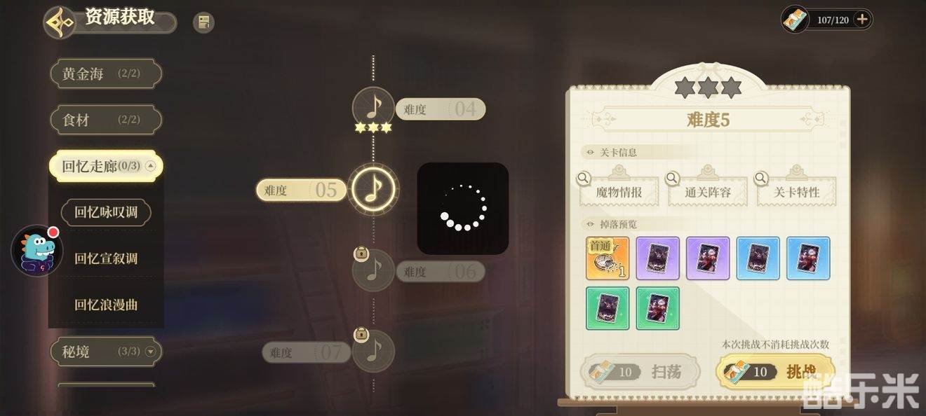 这种图一旦开始是无法更换角色的,但却可以更改所带角色的回忆套装,总共可以刷出5种初始牌序