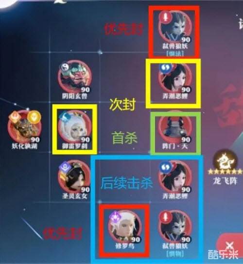 第一回合,封万毒和惧法狼妖(狼妖会优先点杀灵兽,合欢记得红封),奶辅喝酒,集火阵门(伤害溢出的话记得分点灵兽去打悍牛)。
