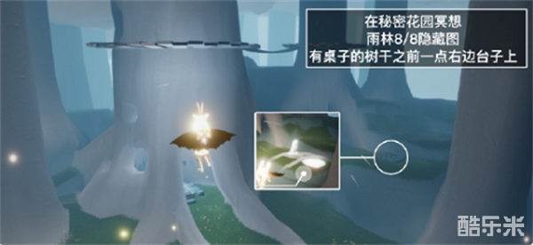 4、在秘密花园冥想:在雨林8/8隐藏图内,内有桌子的树干右边石头上的石碑前光圈处打坐并留言,完成第四个任务。