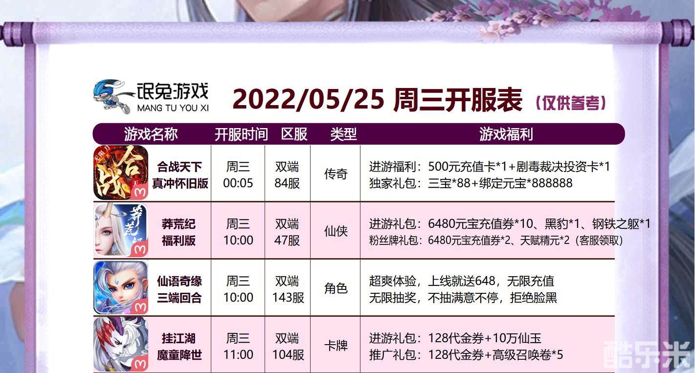 | 挂江湖 | 江湖104区( 苹果- 安卓) | 2022-05-25 11:00:00 |