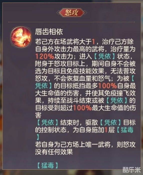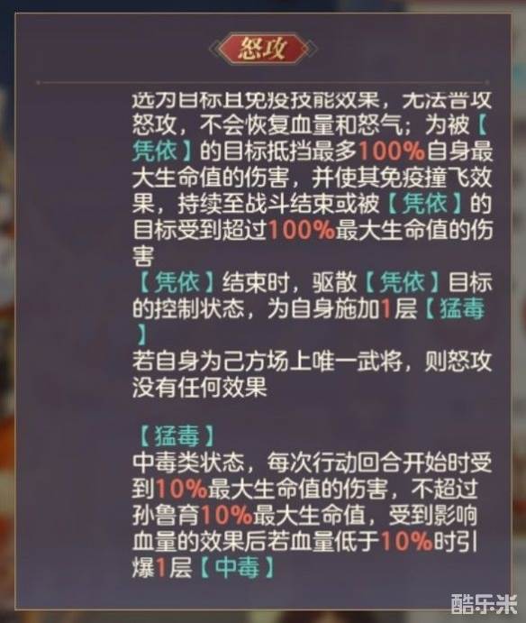 孙鲁育的核心技能,后续所有的被动都是建立在怒攻的【凭依】之上的。凭依的触发条件需要孙鲁育怒攻,若是没怒气,孙鲁育将会失去所有功能。作为突击武将,孙鲁育可以做到入场即满怒,但需要注意的是即便孙鲁育自带80%的怒气抗性,依然有极端情况下可能被减怒导致无法开局开出怒攻,亦或是风物志带来的初始怒差距导致无法怒攻。