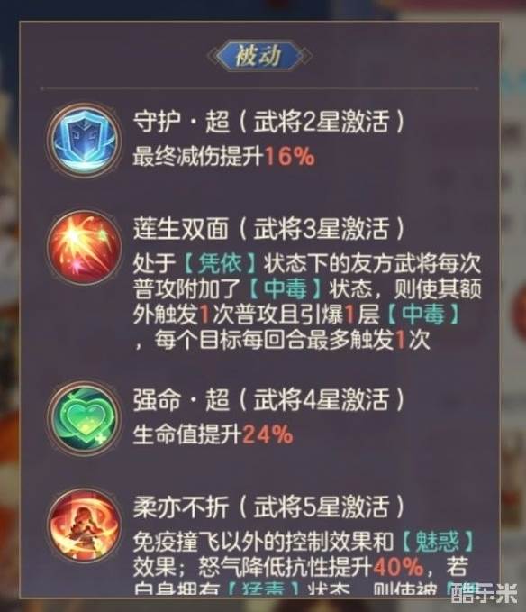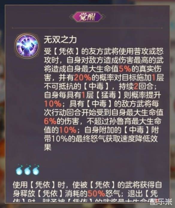 此技能文字较多,简单来说就是让被凭依的武将能够普攻怒攻概率施加中毒。【注】此技能效果无法触发3星被动效果(中毒被记作来自孙鲁育)。如果孙鲁育是单挂的情况下,施加中毒的概率仅为20%;反之,通过羁绊开局获得2层猛毒,可以做到40%概率的普攻怒攻施加中毒。