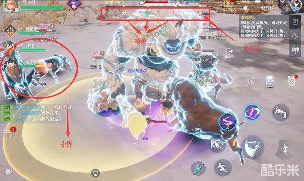 1.进入战斗后,从进度条上可以看出整场战斗中,与精英怪和小怪的交战时间最久,因此在攻击类属性中,增伤的优先级为: