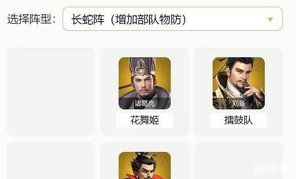 2.推荐阵型:长蛇阵,在3x3的格子中诸葛亮和刘备分别占第一排靠右的两个格子,曹操站在第二排中间,最下面一排靠左的两个格子是曹仁和袁绍。