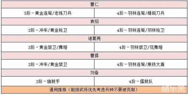 曹仁,三阶黄金连弩/老练刀兵,四阶羽林连弩/精锐刀兵
