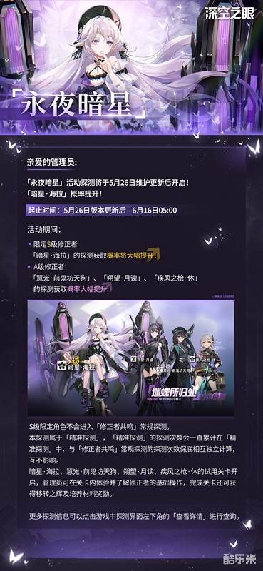 「永夜暗星」活动探测也同步开启,活动期间,限定S级修正者「暗星·海拉」,A级修正者「慧光·前鬼坊天狗」、「朔望·月读」、「疾风之枪·休」的探测获取概率将大幅提升!