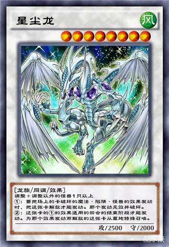 效果的保护和苏生对雷破等破坏的卡来说还是比较不错的,但星尘龙自身打点环境内不算高,面对无底加拿大虫等卡表现也比较一般,总体而言感觉强度一般,不是情怀党应该不用特地抽。