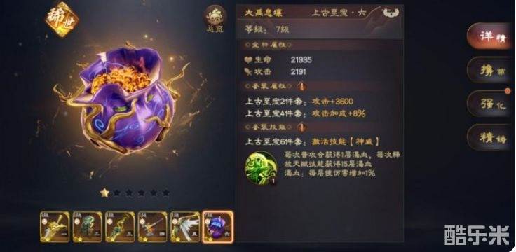 凑齐六件宝物后,激发“神威”技能,将增加有效伤害、攻速。配合着甘宁的高输出,助甘宁在战场上大杀四方!