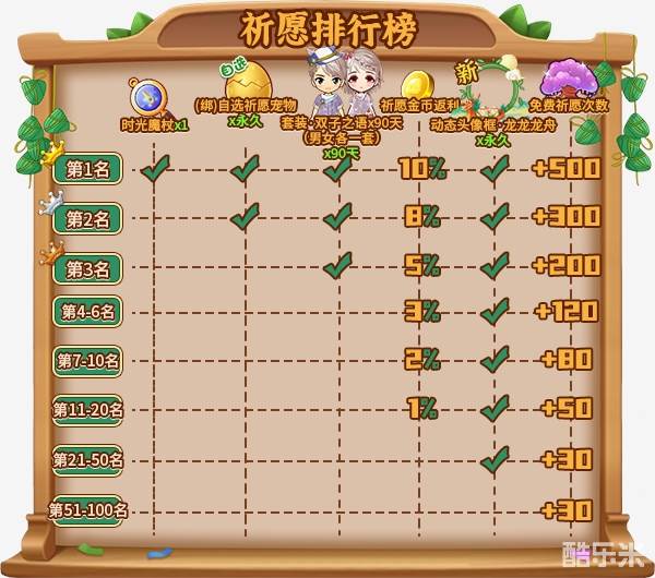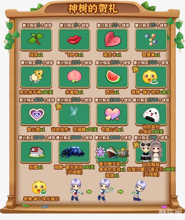 活动期间,根据您在“祈愿神树”购买绿芽的数量,领取神树的贺礼!并且还将对小伙伴们购买绿芽的数量进行排名,在活动结束后,为排行榜上前100名玩家发放奖励!