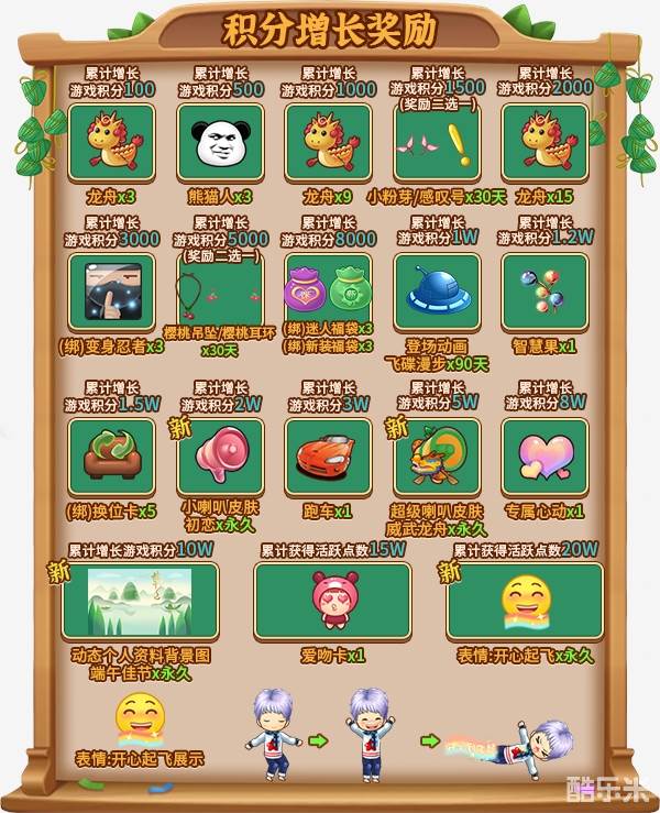活动期间,每通过接收道具增长20游戏积分,即可领取1份非绑定“龙舟”。