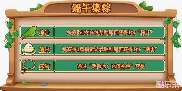 活动期间,让我们一起来包粽子吧!这里有一些材料等你收集:粽叶、糯米和麻绳!通过以下三种方式,您有机会获得这些材料: