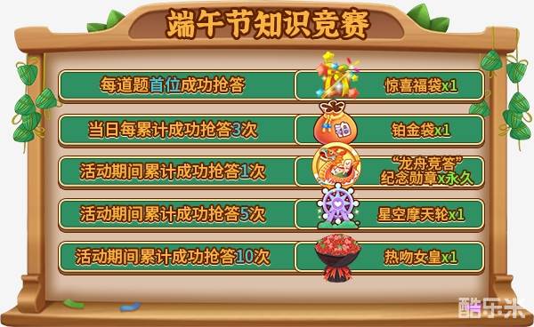 4、“龙舟竞答”纪念勋章、星空摩天轮、热吻女皇每位玩家最多只能获得1次;
