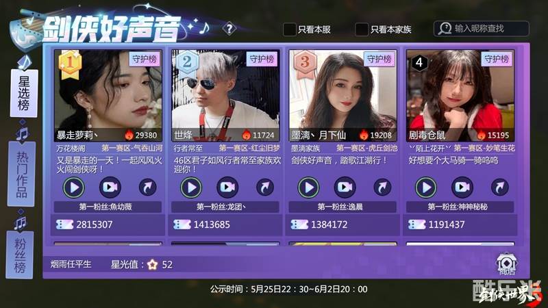 由西山居金牌团队打造的《剑侠世界3》一直秉持为诸位热爱武侠的少侠带来更多快乐的理念打磨游戏品质,创造精彩活动。在初夏之际重磅推出的剑侠好声音正是一次卷入全服玩家,共同造梦的尝试。我们希望借助这次活动让各位少侠发现,来剑侠世界,不仅能够作为侠客享受纵马江湖的潇洒,家族群战的热血,亦能展示自己的独特才华,甚至有成为剑侠江湖的超级明星!而这才是一个真正的江湖!