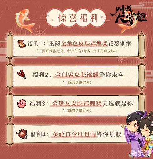 先来看看掌柜们最关心的直播福利都有哪些吧。首先,迎面向我们走来是最受瞩目的锦鲤—全角色皮肤大奖,包括所有门客+挚友+主角皮肤一次性通通到账。汴梁城周年最幸运的锦鲤会是你吗?不要心急,皮肤锦鲤不止一家,还有全门客皮肤锦鲤(包含所有门客皮肤),及全挚友皮肤锦鲤(包含所有挚友皮肤)。小孩子才做选择,身为锦鲤的掌柜当然全都要!