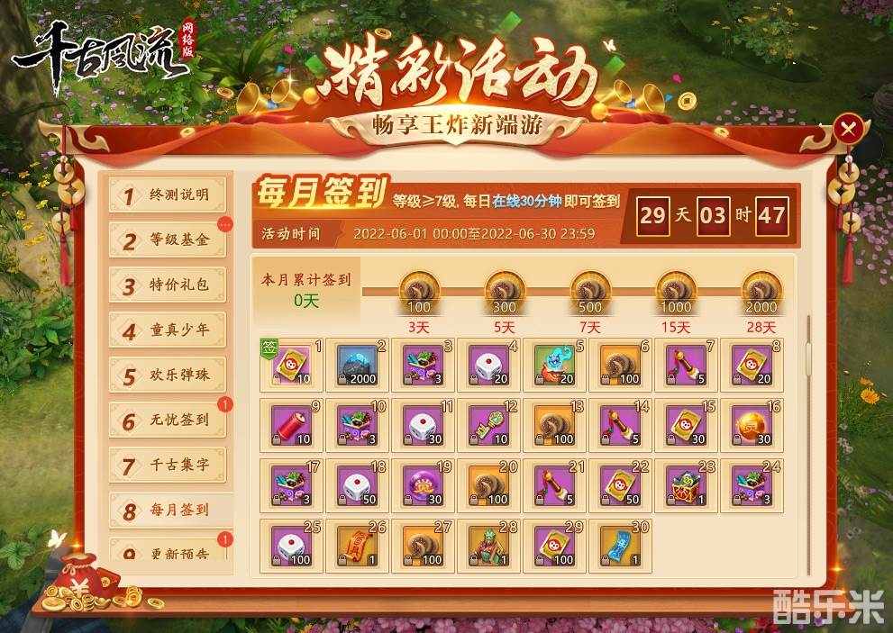 为了迎接即将到来的6区·用在一朝,官方特别准备了海量预约好礼,现在前往《千古风流》官网进行预约,即可免费获得绝版限定称号、大量成长之路必备物资!除此之外,还有六月份签到活动,不仅每天签到能够领取奖励,每天的奖励都不一样;还有累计签到天数的达到能额外领取烧饼,签到奖励价值6000元!白嫖的烧饼香不香,怎么能不算呢!