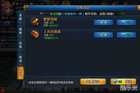没有难度,找回就是最简单的获取经验方式,只需要点一下就行了,在昨天没有完成的任务中只要有钻石就可得到相应的任务奖励,每天有一次免疫找回权利,当然这是有钱人的方式,虽然效果很简单!