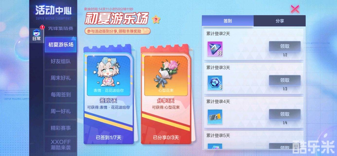系列全新活动也一起来袭!“初夏游乐场”——签到、分享领多样好礼,累计签到七天更可获得B级表情“花花送给你”。夏日初启,游乐场相遇,送你一朵小花花~