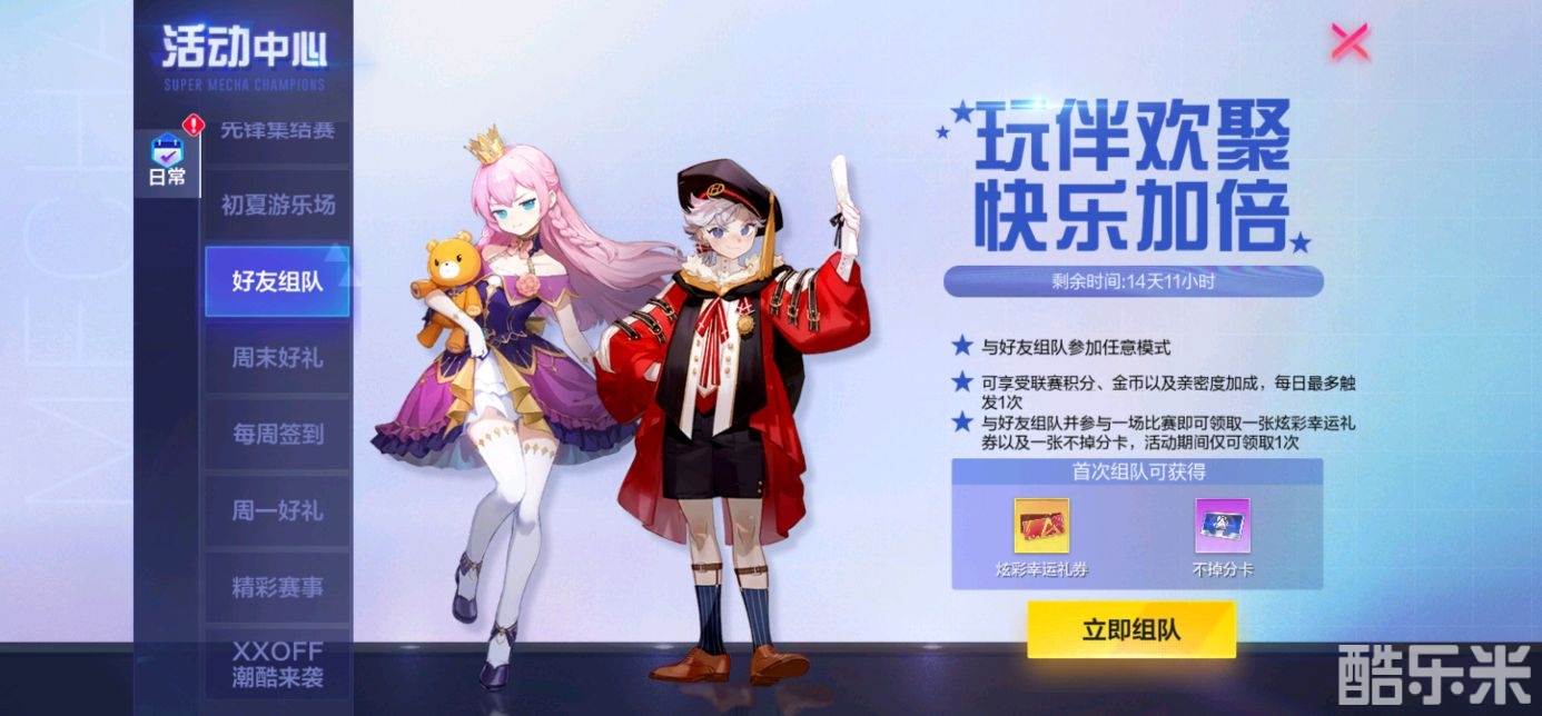 玩伴欢聚,快乐加倍!与好友组队享受金币及亲密度加成,更有不掉分卡及炫彩幸运礼券等你来拿!
