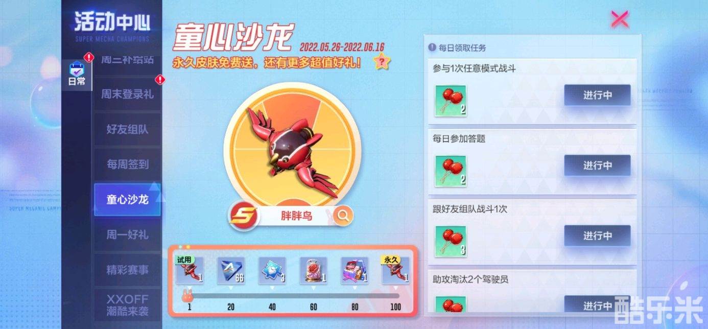 英雄永不死,童心永不灭。参与“童心沙龙”活动,完成任务累积“棒棒糖”,永久获得飞行器皮肤“胖胖鸟”!