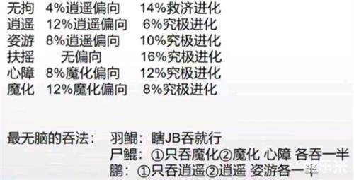 1.鹏:只吃逍遥和恣游就可以,逍遥优先,要先吞逍遥,只要保证逍遥百分比大于究极进化就好,除了逍遥还可以吞恣游,不要误吞其他的。