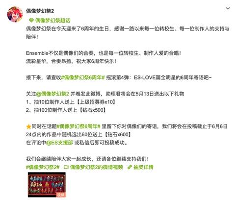 Ensemble不仅是偶像们的合奏,也是每一位转校生、制作人爱的合唱。LOVE篇全明星为玩家送上六周年寄语的同时,《偶像梦幻祭2》官方也在微博征集玩家对偶像们的寄语,更凸显出游戏和玩家的互相陪伴。