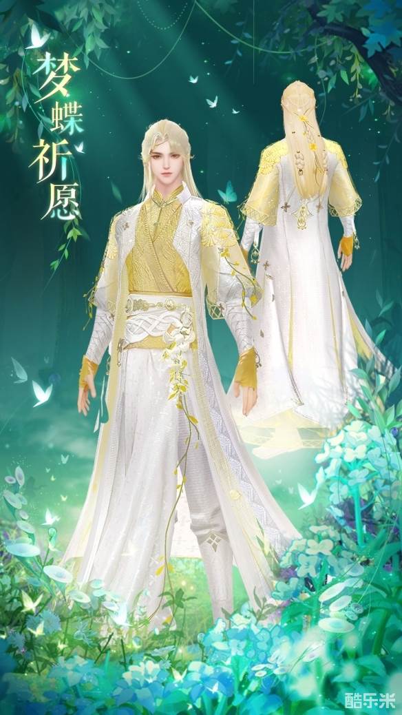 男版【碧山秋暮】以澄黄与雅白为主调,淡金色长发披于脑后,额前的刘海被藤蔓轻柔地挽起,露出少侠坚毅的目光。烫金与暗银丝线在每一层衣衫上绣出了繁复花纹,低调之余而不失别致。腰间垂下的繁花几朵,与肩臂上层叠的金丝枫叶遥相呼应,给人儒雅亲切之感。