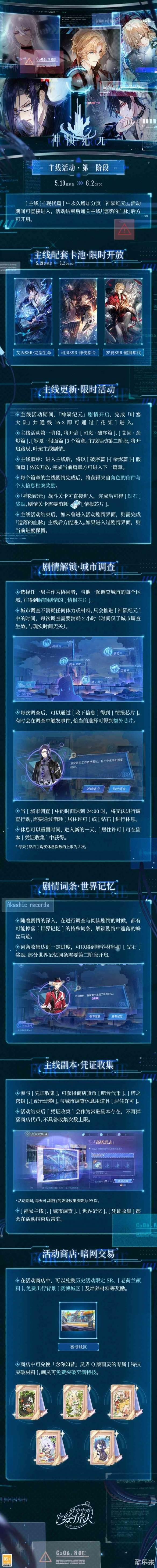 ◆主线第一阶段将开启【司岚·破序篇】、【艾因·余烬篇】、【罗夏·假面篇】3个篇章,【城市调查】可选择司岚、艾因、罗夏,配套卡池限时开放。活动结束后,需完成「遗落的血脉」主线后方能进入「神陨纪元」剧情。