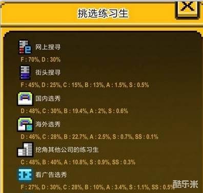 我们康康抽奖的爆率,发现,这个看广告出B及以上的爱豆其实有很高的概率,而且十分钟就可以一次,我们的目标是出一个至少B-的爱豆。正常情况下,不是非酋一个小时左右都可以出出来。