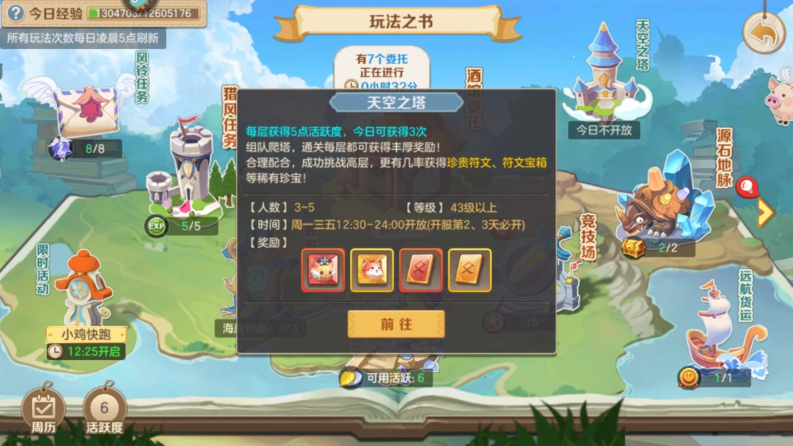 (2)任务条件:天空之塔需要组队参加至少需要3—5人,全员等级要求43级以上,任务开放时间为周一、三、五12:30—24:00开放(开服第2、3天必开)。
