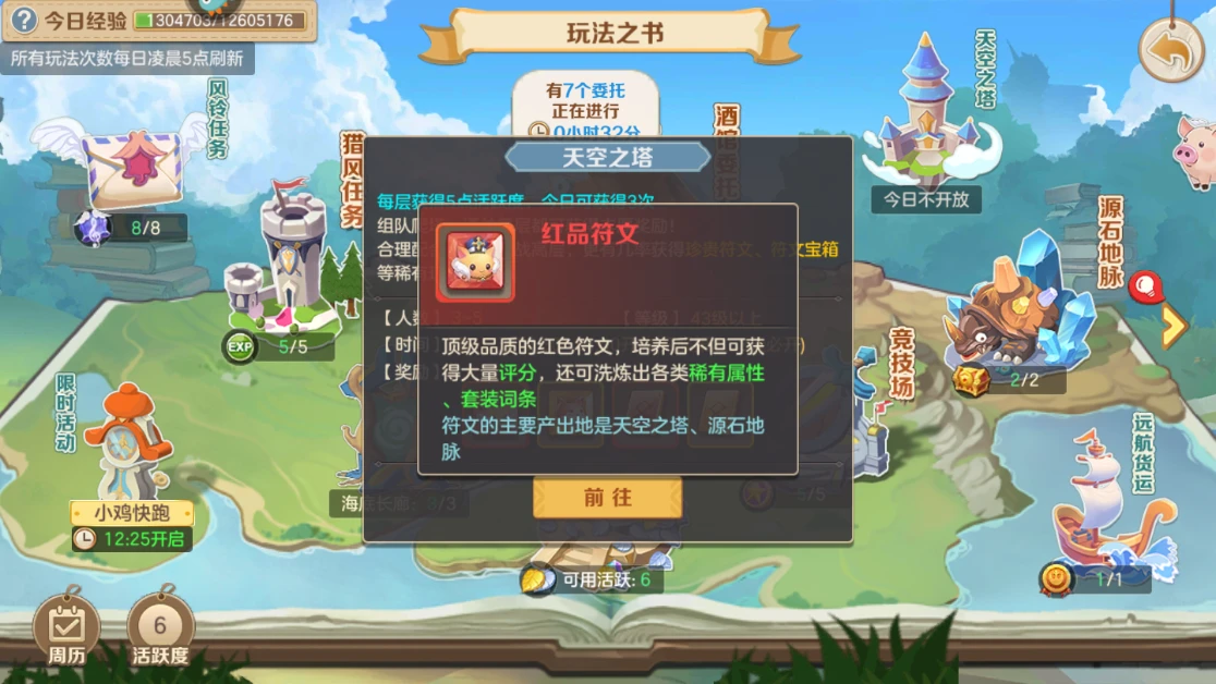 (1)天空之塔:组队爬塔,通关每层都可获得丰厚奖励!合理配合,成功挑战高层,更有几率获得珍贵符文、符文宝箱等稀有珍宝!每层获得5点活跃度,每日可获得3次。