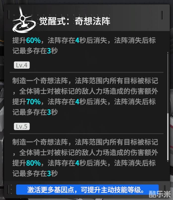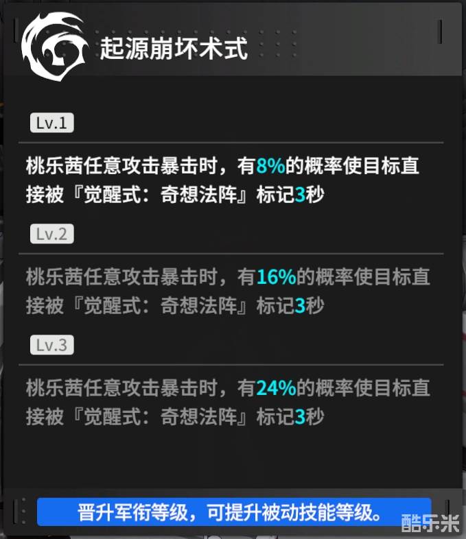 暴击的时候额外赋予目标【觉醒式:奇想法阵】的标记效果,可以让桃乐茜在没有【觉醒式:奇想法阵】的情况下,也能有效的对目标造成额外力场伤害,被动1级的时候概率只有8%,但是满级的时候高达24%,桃乐茜攻击速度快还是非常容易触发,只是触发依赖暴击,因此在装备的选择上可以优先考虑暴击率。