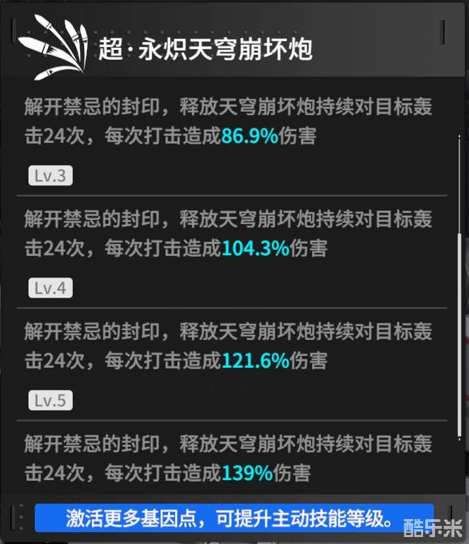 主要强化【超·永炽天穹崩坏炮】,每一枚导弹都有50%的概率造成额外60%(满级180%)对力场伤害,配合【觉醒式:奇想法阵】,满级时可以达到的260%的对力场伤害,因此在战斗中,先使用【觉醒式:奇想法阵】再使用【超·永炽天穹崩坏炮】,依靠较高伤害倍率,可以打出非常高的对力场伤害。